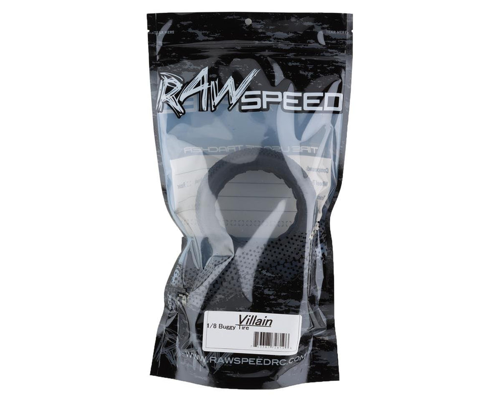 This is a pack of two Raw Speed RC "Villain" 1/8 Truggy Tires. The Villain is a large pin directional tire that excels in conditions that are medium to hard packed with light to medium loam on the surface and is available in multiple rubber compounds. Package includes two Villain Truggy tires and two foam inserts.