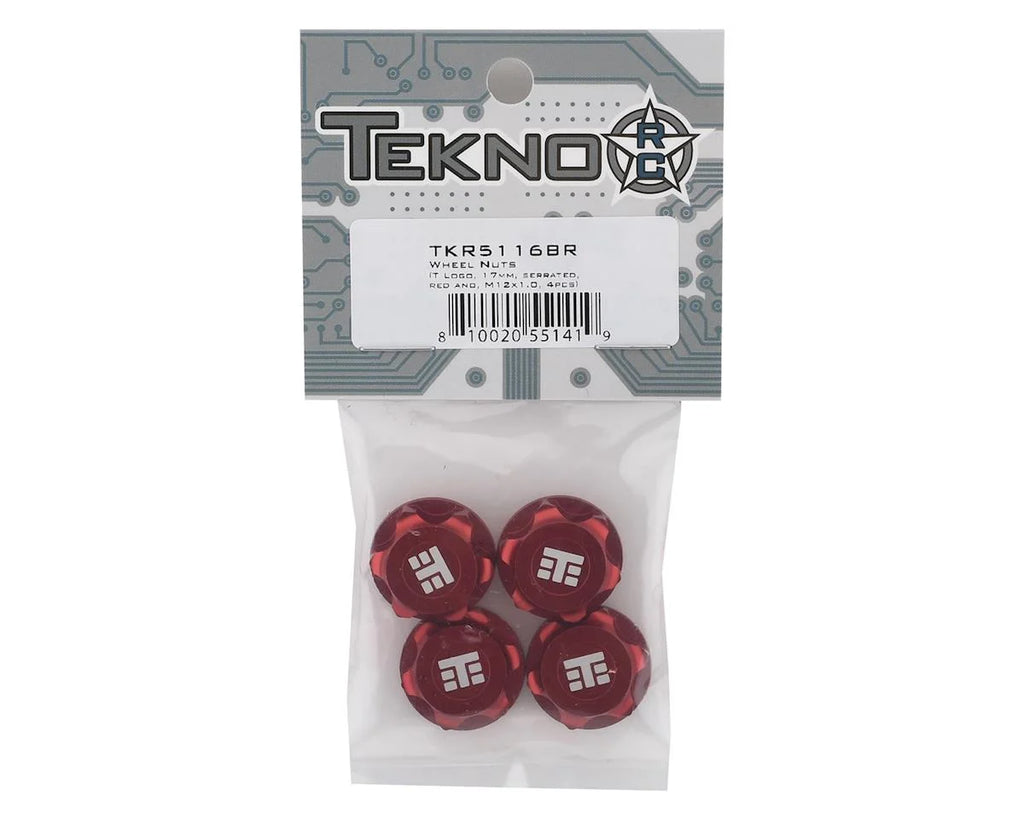This is a pack of four Tekno RC 17mm Aluminum "T Logo" Covered Serrated Wheel Nuts, intended for use with 1/8th scale Tekno kits. These wheel nuts are machined from quality aluminum with a red anodized coating for an added flash of color.
