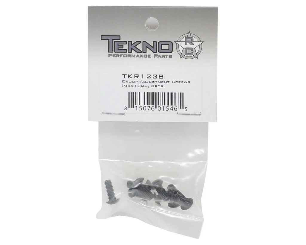 This is a pack of eight optional Tekno RC 4x10mm Button Head Droop Adjustment Hex Screws. These updated droop screws makes it a breeze to set droop on your vehicle. A 2.0 hex is machined on the shank end for easy adjustment and a normal 2.5mm hex is on the button head. They are compatible with virtually all 1/8th scale vehicles including the Tekno RC EB/NB/ET/NT48 and also our SCT410. Manufactured from high quality steel. One package will outfit 2 vehicles.
